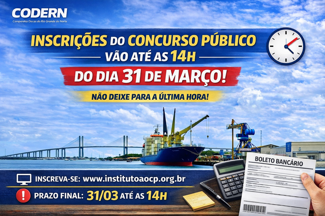 A Companhia Docas do Rio Grande do Norte (CODERN) alerta os interessados que o prazo para inscrições em seu concurso público se encerra às 14h do dia 31 de março.